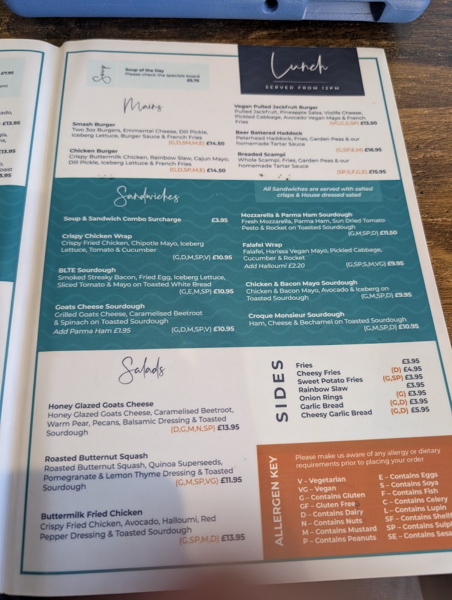 The menu features a variety of options suited for breakfast, light meals, and casual dining throughout the day. It includes classic breakfast dishes such as porridge, scrambled eggs on sourdough, full Scottish and English breakfasts, as well as vegan and vegetarian breakfast choices. For lunch and light bites, there are sandwiches and bagels, including brisket and smoked salmon options, alongside a selection of burgers served with crisps and side salads.